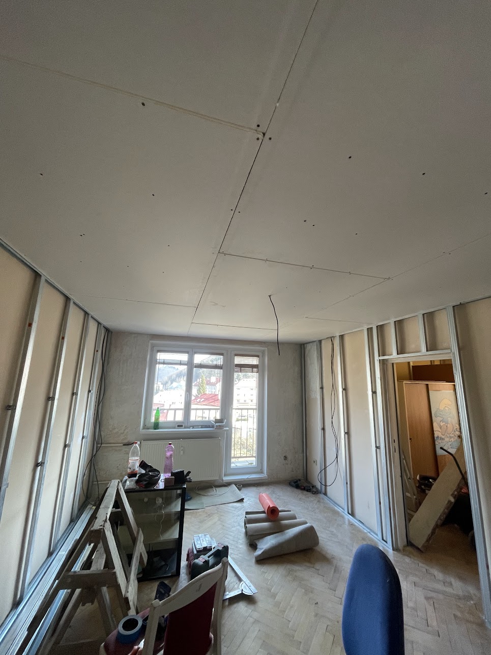 Rozsah: 65 m²Popis: Montáž konštrukcie, osadenie sadrokartónu, izolácie, tmelenie, brúsenie a finálny náter.